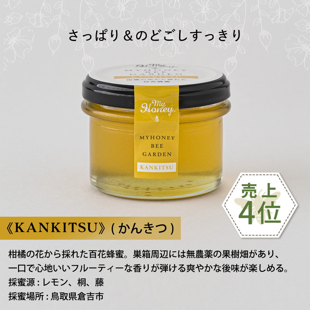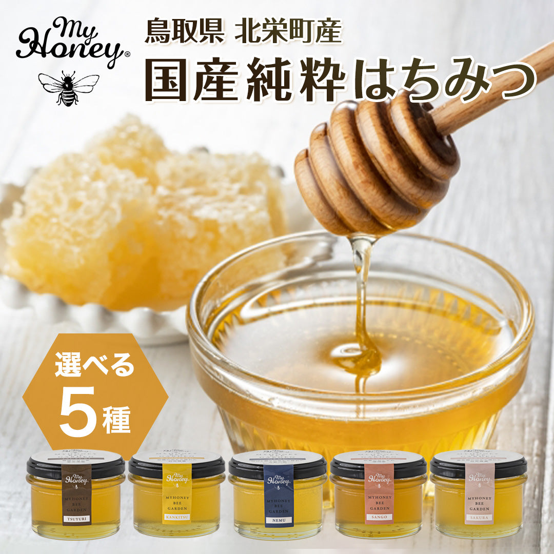 鳥取の大自然の光を浴び、力強く咲いた花々から採れた、個性豊かな5種の自社採れはちみつをお届けします。