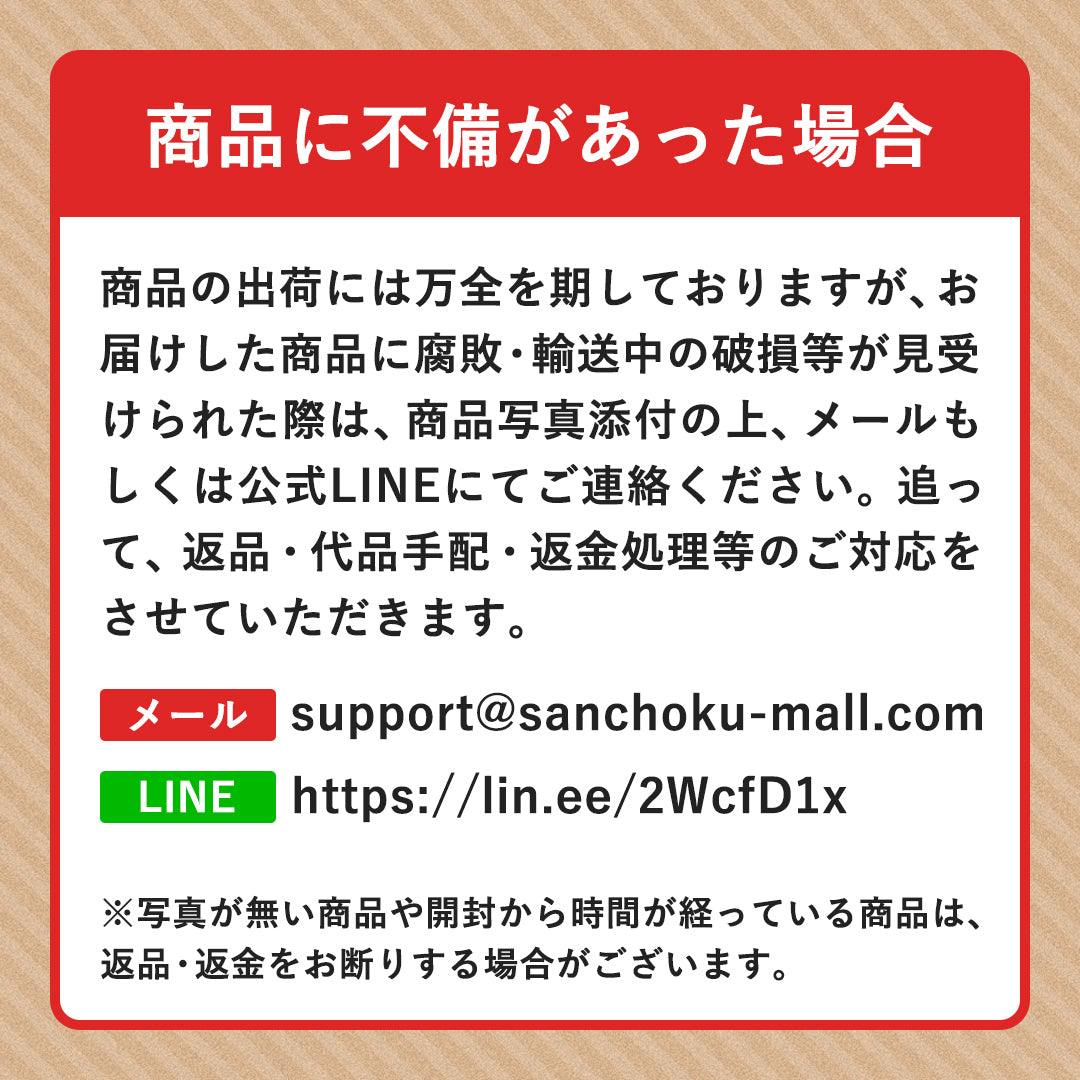 万が一、お届けした商品の配送間違い、品質に問題、輸送中の事故があった場合、不備の内容に応じて、返金や代替品の送付の保証対応をさせていただきます。レビューからの不備連絡ではなく、LINEもしくはメールにてご連絡ください。1営業日以内にご対応させていただきます。
