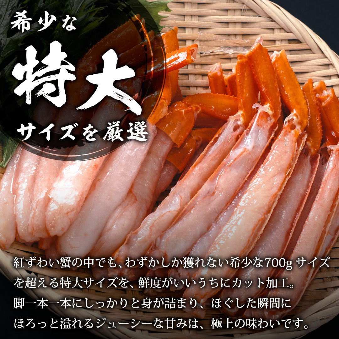 境港で水揚げされた紅ずわい蟹の中でも希少な700g超えの特大サイズのみを使用しています。