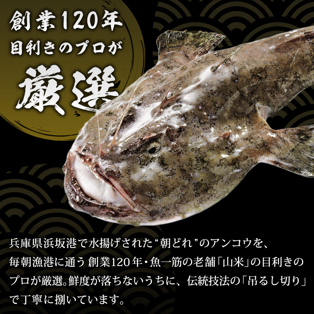 兵庫県浜坂港で水揚げされた新鮮な“朝どれ”アンコウを、創業120年・魚一筋の老舗「山米」の目利きが厳選。